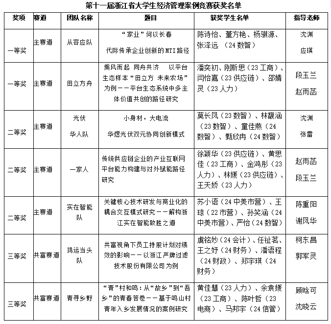 浙江省大学生经济管理案例竞赛是省级A类学科竞赛,由省教育厅、省经济和信息委员会主办,共分主赛道、共富赛道、公共管理赛道三个赛道,全省共有596支队伍(含研究生)参赛。大赛旨在促进我省高校经济管理类专业建设,提升案例研究与教学水平,增强大学生的实践创新能力和团结协作精神,发掘、提炼、传播当前经济转型和产业升级过程中的管理创新实践特色与亮点,为推广先进适用的管理理念、方法和模式提供案例借鉴。