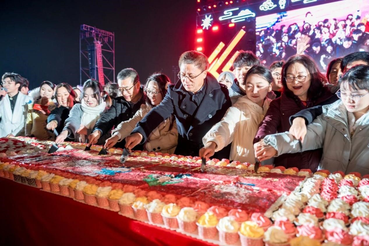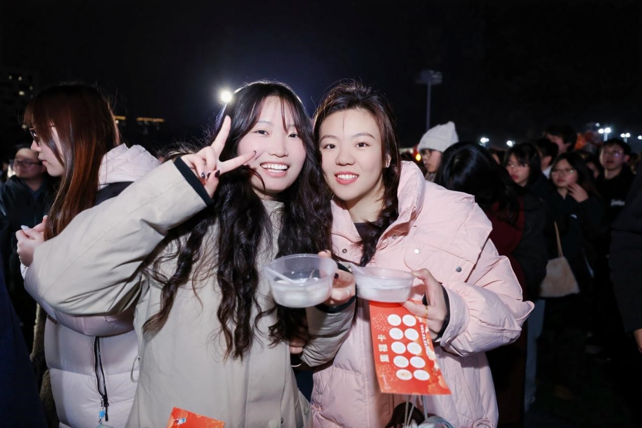 伴随着“菜宝”之歌、“菜宝”之舞的动人旋律和青春舞姿,校党委书记、校长魏江宣布并动首个学校“菜宝日”活动。在全场的欢呼声中,魏江书记带领班子成员倾情合唱的《龙的传人》,引发全场万人动情合唱,将现场推向最高潮。零点钟声敲响时,漫天彩色气泡如星雨坠落,倒计时灯光秀在夜空中绽放,定格“辞旧迎新”的永恒浪漫。活动期间,校领导们与12月31日和1月1日的寿星们一同庆祝生日,为同学们送上暖心汤圆、鱼灯等具有新年意义的“福”气等,祝福广大浙财学子新年快乐、学业有成!