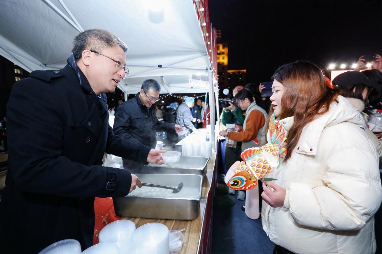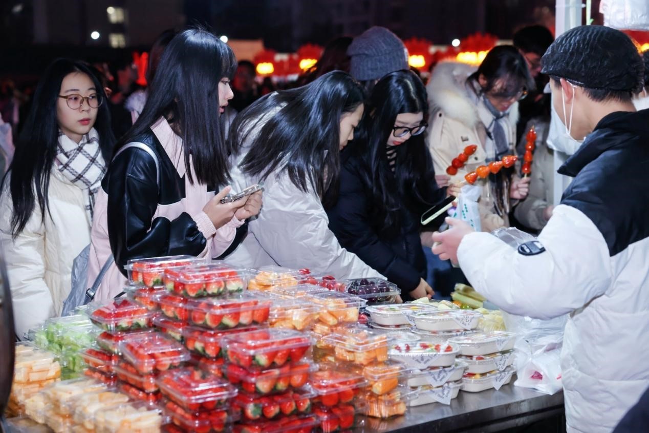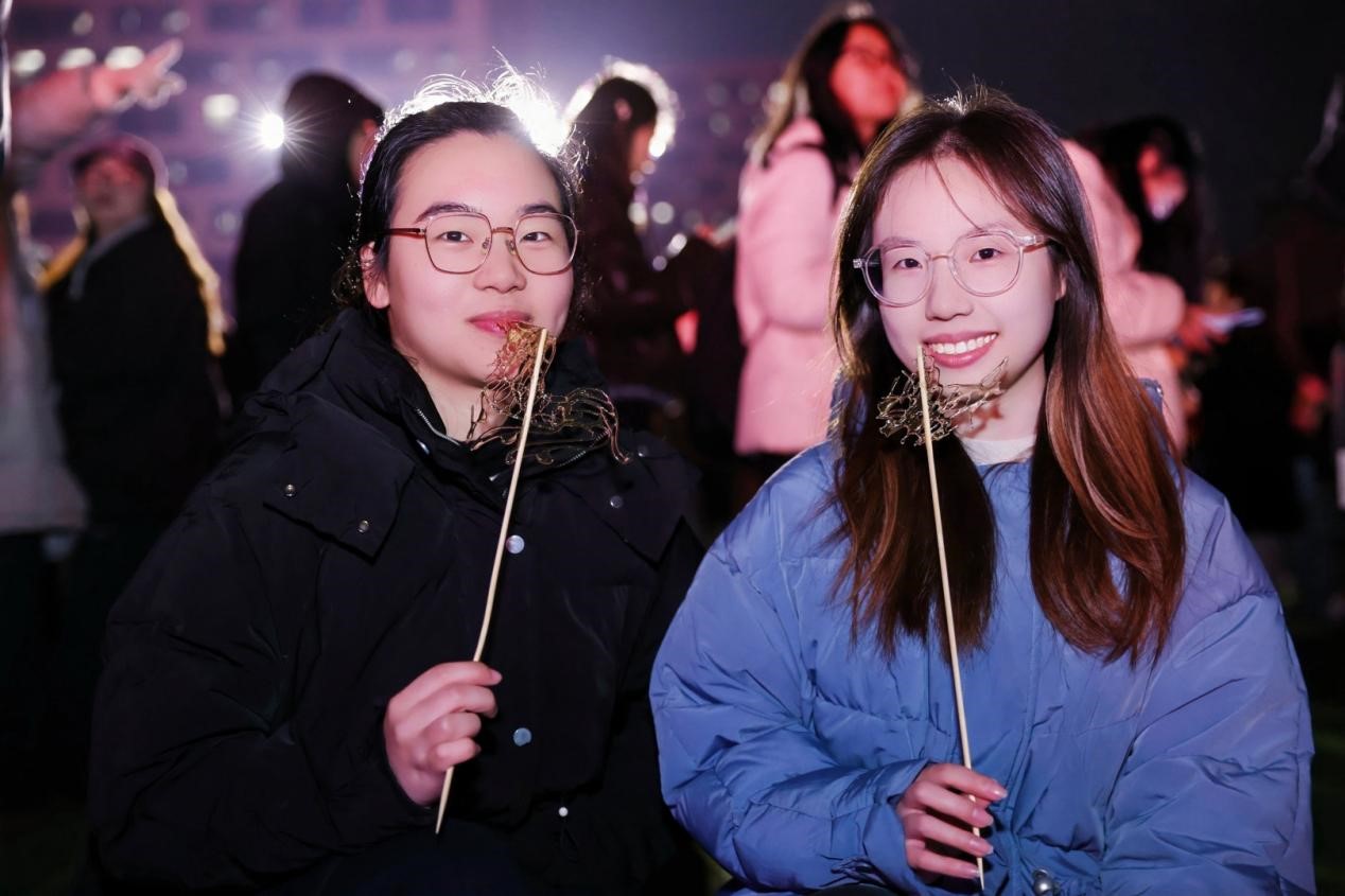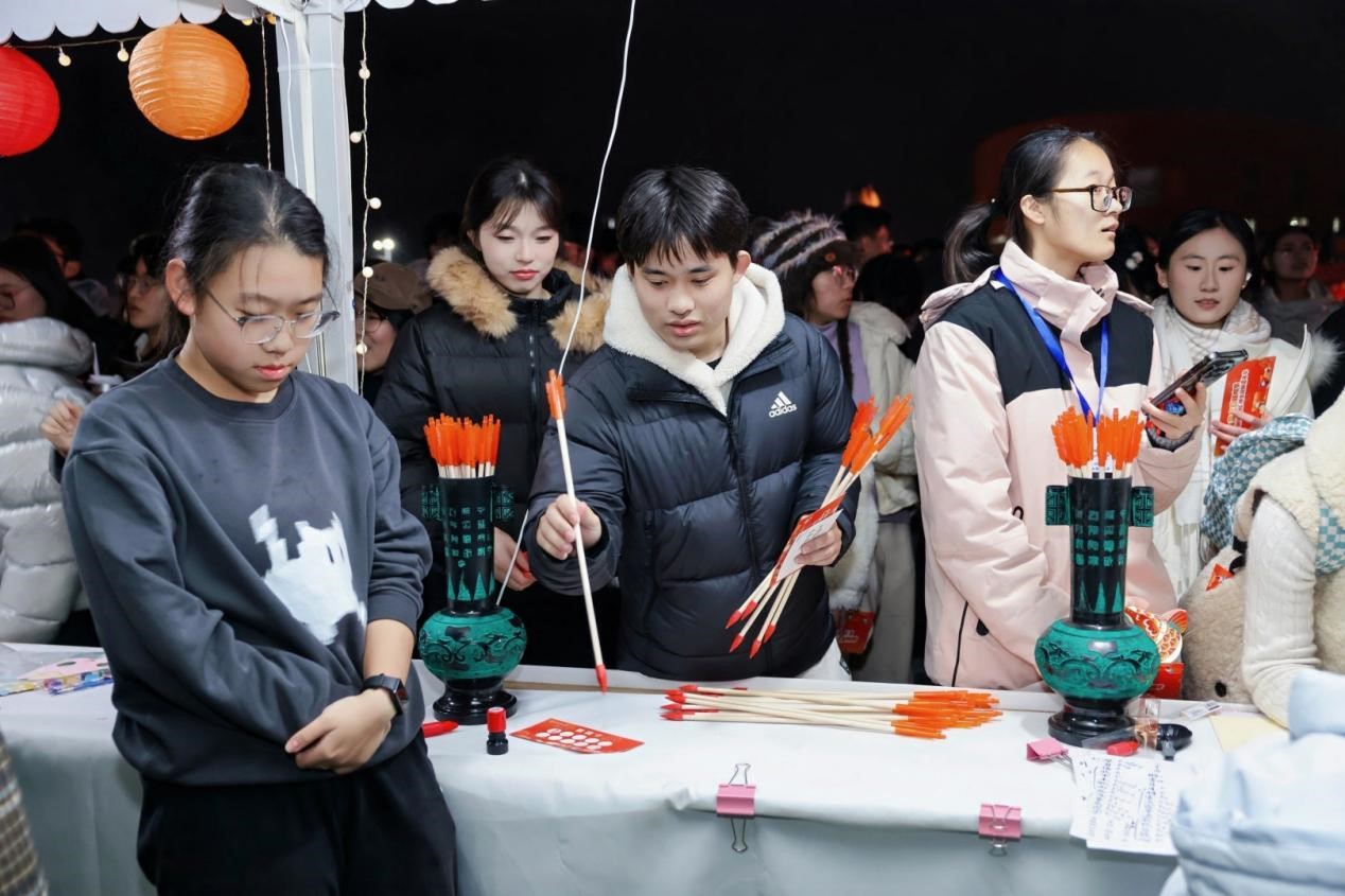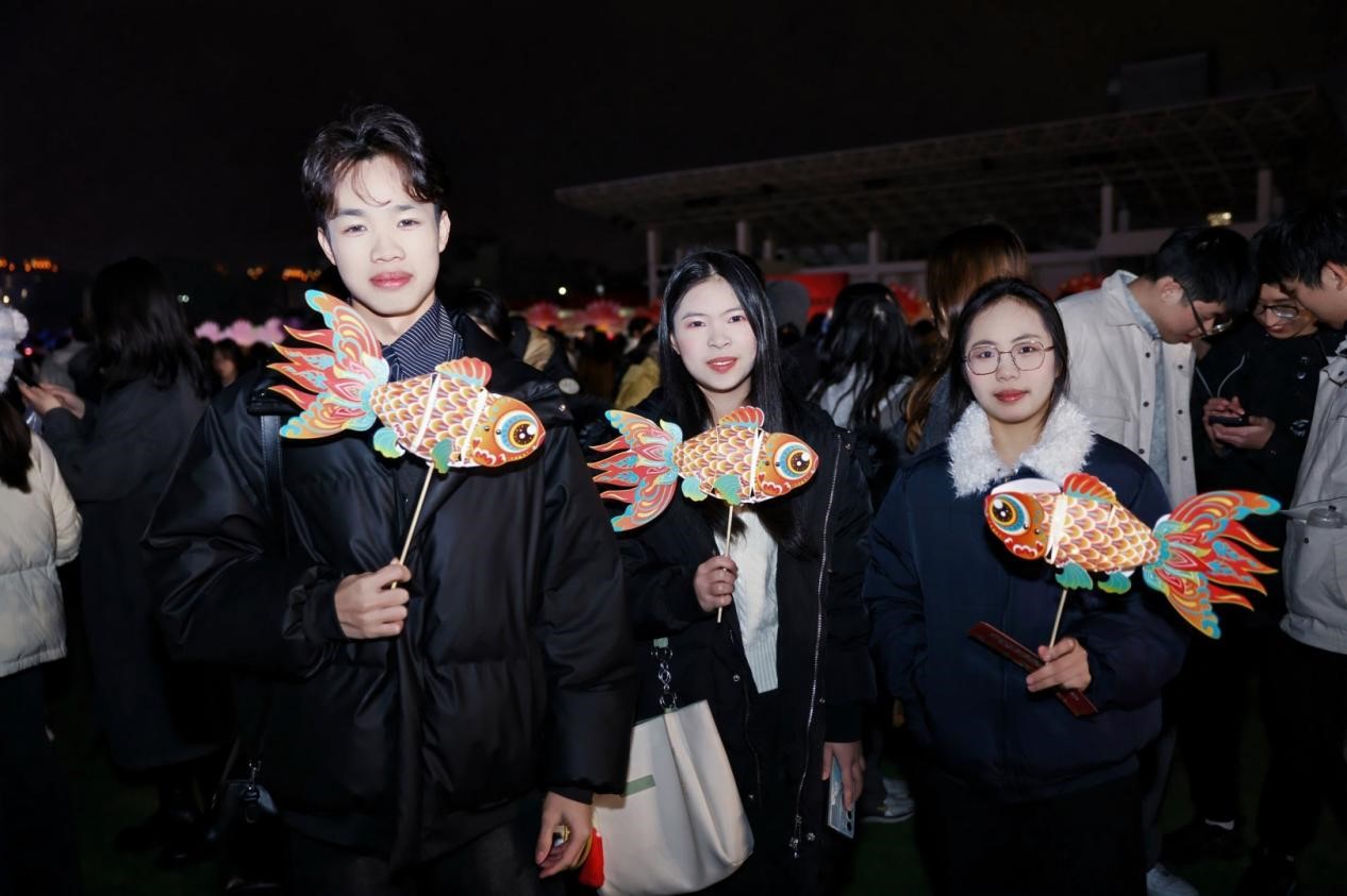 火壶表演如流星划过夜空,鱼灯巡游似游龙蜿蜒,年糕糖画、趣味拓印、莲纹投壶、传统木射……20余项非遗表演深受同学喜爱,同学纷纷上阵体验传统文化的魅力,亲手制作非遗美食,在动手实践中触摸文化根脉。