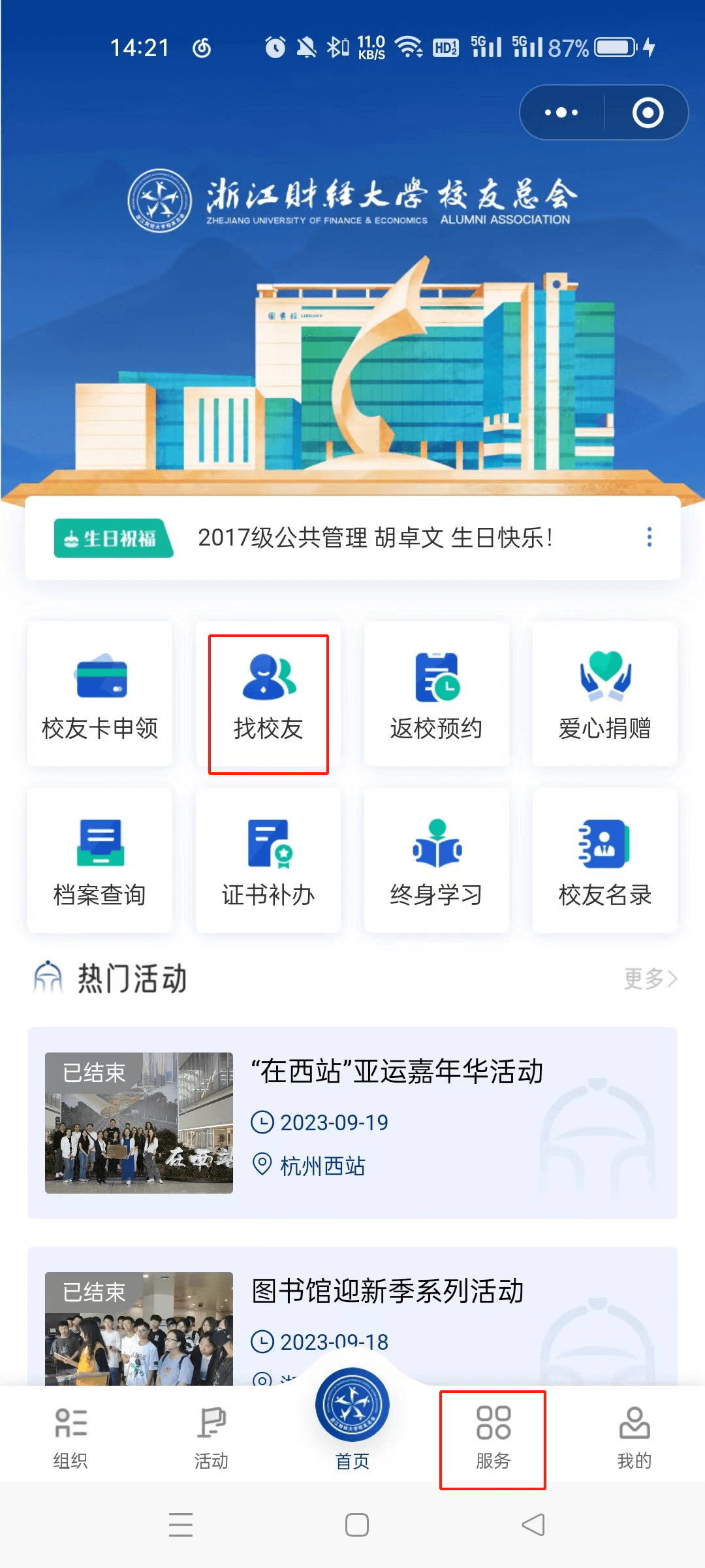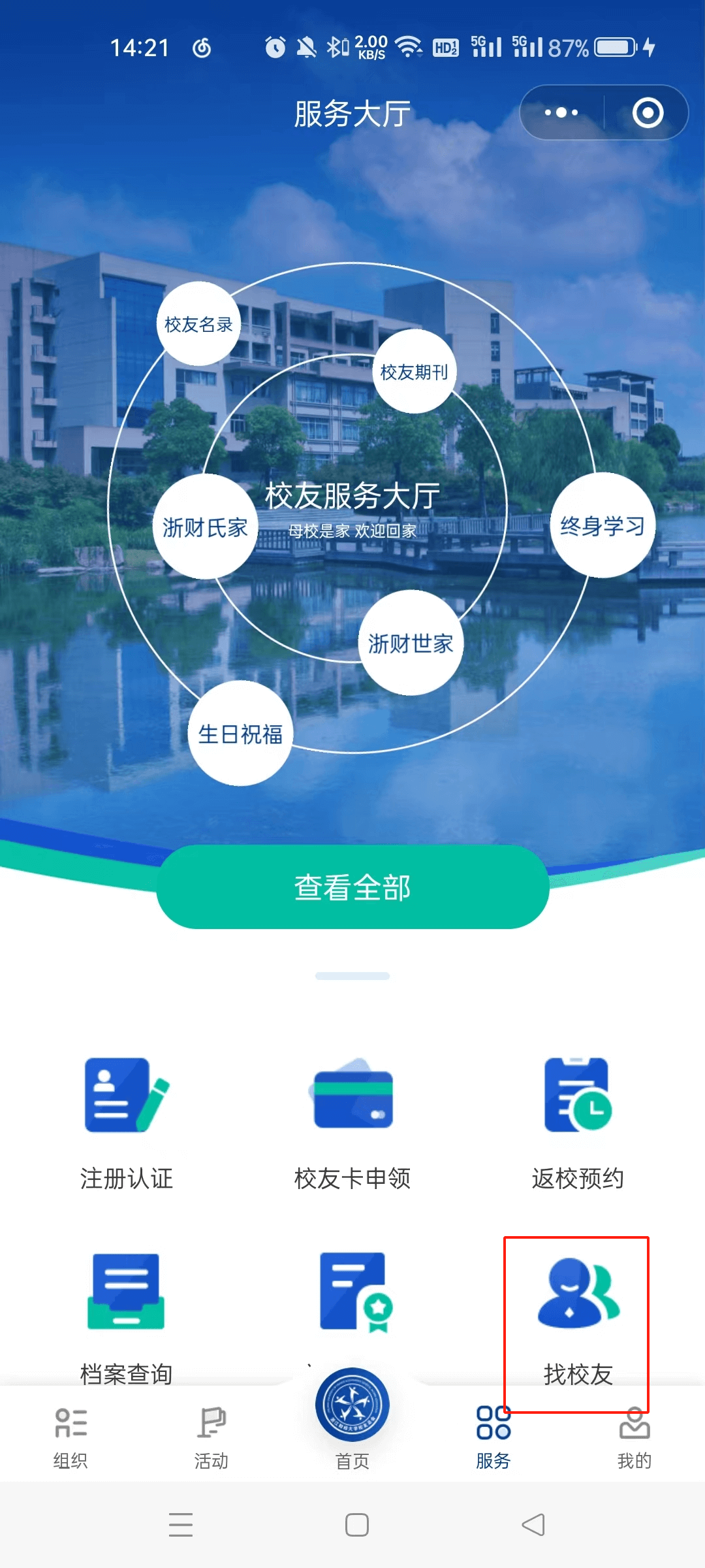 二、点击小程序首页的快捷菜单“找校友”;或者点击底部“服务”,进入服务大厅,点击“找校友”;