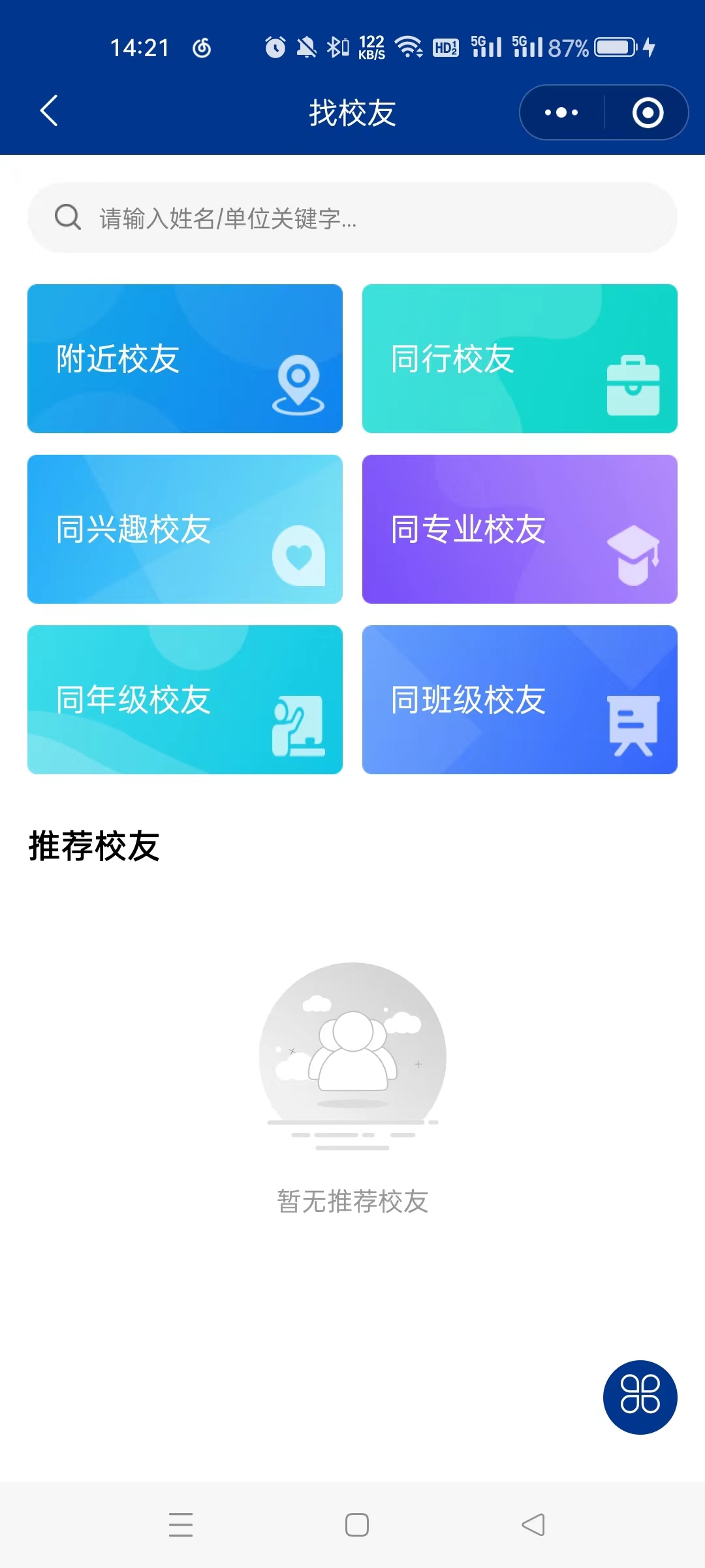 三、进入“找校友”页面,可以点击“附近校友”“同行校友”“同兴趣校友”“同专业校友”“同年级校友”“同班同学”进行找校友。