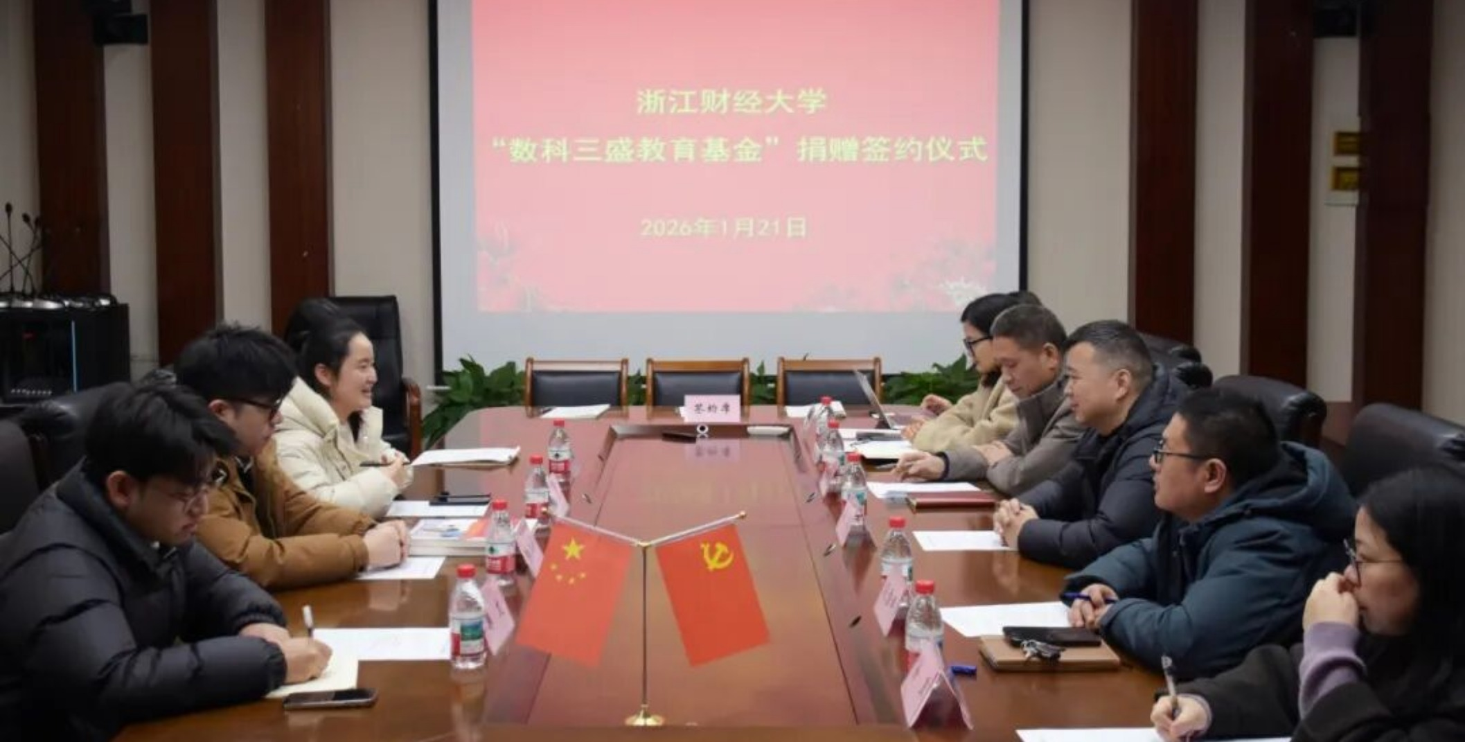 1月21日上午,“数科三盛教育基金”捐赠签约仪式在数据科学学院举行,发展联络办、校友办主任吴玻,数据科学学院院长洪兴建,党委书记段雪辉等校方代表,与三盛深脑信息咨询(杭州)有限公司总经理钱小燕、运营总监庞铭鑫等企业嘉宾共同出席仪式。洪兴建向三盛教育对学校办学的支持表示衷心的感谢。他介绍了学院在“数据+财经”特色学科建设、人才培养与科研创新等方面取得的成果,指出此次基金设立为学校发展注入了资源,体现了企业的社会责任,也为深化校企合作与优化人才培养模式提供了强大支持。钱小燕表示,三盛教育始终关注教育服务与大学