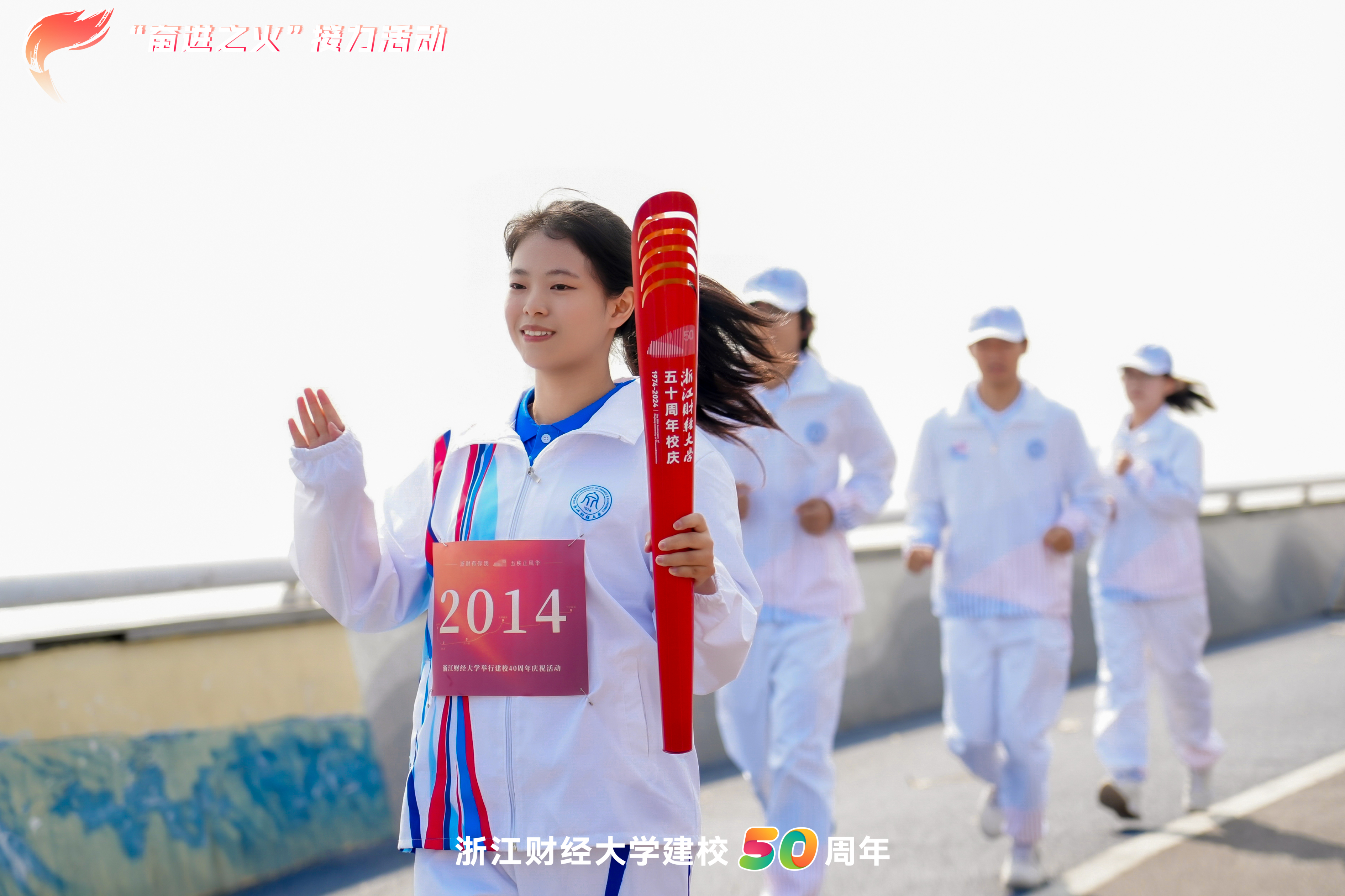 本网讯 11月2日上午,浙江财经大学50周年校庆系列活动之“奋进之火”火炬传递接力活动在钱塘江江堤举行。50名师生校友,高擎纪念办学50周年火炬,在钱塘江堤进行50棒接力跑。“奋进之火”火种采自学校办学起始地杭州七堡蚕种场,由校运动员代表护送火种,途经乌龙庙、文一路94 号、文华路269号,沿着学校办学足迹,护送至钱塘江堤。