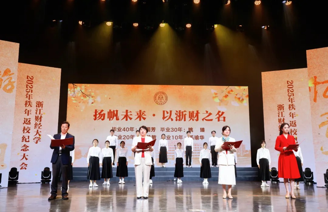 诗朗诵《以浙财之名》在温情的氛围中登场。1985届罗国芳、1995届姚臻、2005届高佳敏、2015届毛瑜华与18名学生代表并肩而立,共同发出“以‘浙财’之名,承初心之诺,赴未来之约”的铿锵誓言。当饱含深情的念白因激动而微微颤抖,这场跨越四十年的声音接力在娓娓道来中点燃全场的热情。