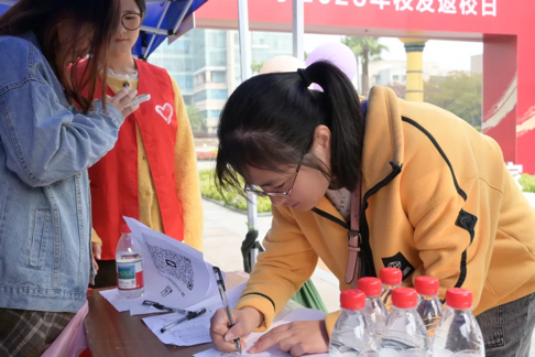 完成签到的校友,还会收到一份独特的人文纪念品,或是刻有学院印记的挂件,或是印有人文符号的明信片。再移步至长廊一侧,便是互动区。校友们执笔蘸彩,俯首书写下十年后的星辰与远方,墨迹在纸端游走,将此刻的心绪与期盼一一封存。