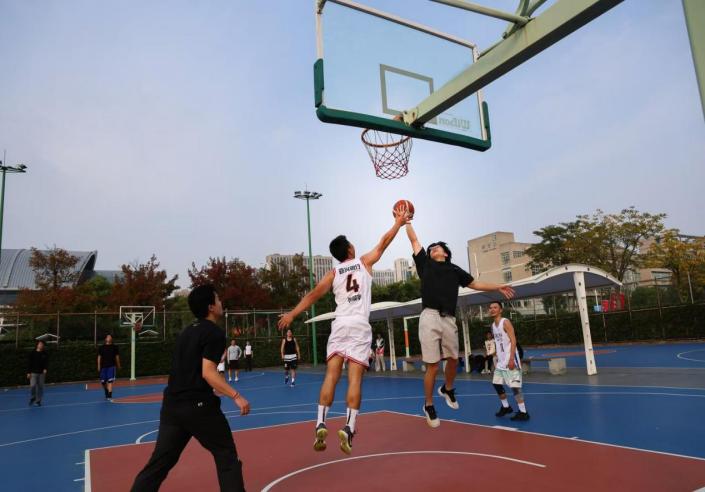 灯光篮球场上回荡着此起彼伏的加油声和欢呼声,一次次的投篮进攻,一次次的击掌欢呼,都在唤醒昔日打球的共同记忆。