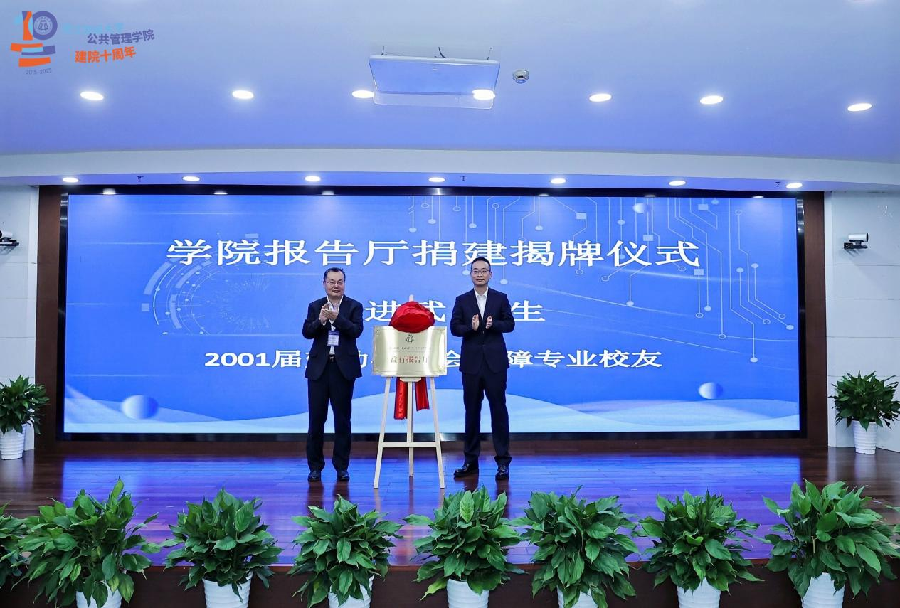 叶进武校友与史云贵教授共同为新命名的学院“益行报告厅”揭牌。