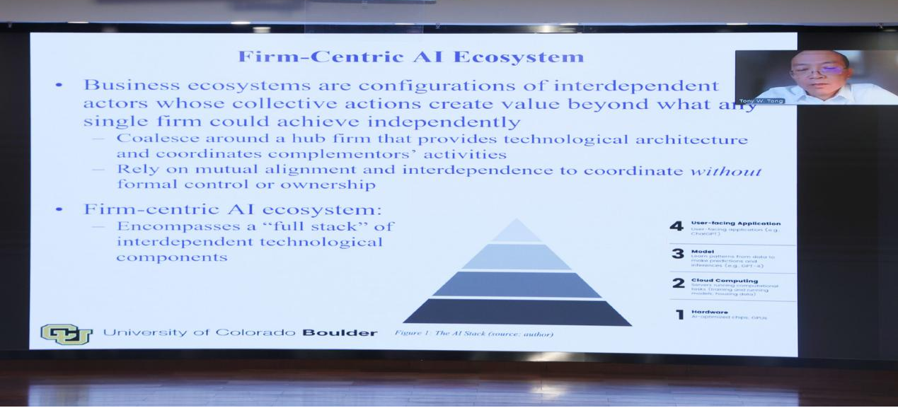 童文锋教授以“全球人工智能竞争背景下国家人工智能生态系统的崛起”为题进行了线上报告。他在报告中提出了一个以国家人工智能生态系统为中心的新框架,探讨了企业在AI时代战略定位的重要性,指出企业可以通过融入AI生态系统来创造价值,认为国家的积极作为正在推动以企业为中心的生态系统整合为更广泛的配置,以符合国家的战略目标。他还分析了全球范围内AI技术的竞争与合作态势,以及地缘政治因素如何塑造AI生态系统的构建,强调企业的成功不仅依赖于传统的资源,而且还依赖于对生态系统的编排。