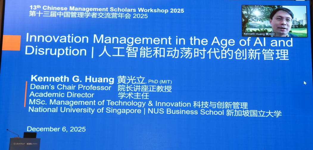 陈明哲教授以“于变局中安身,在学术中立命”为题作线上报告。他结合杭州从阿里巴巴到如今“杭州六小龙”引领全球科技潮流的生动案例,指出杭州的创新实践正是“变”与“不变”的生动注脚,进而提出杭州应立足历史文化与东方智慧,打造“世界的杭州”而非“中国的硅谷”的愿景。谈及管理学者的角色定位,陈明哲教授提出“企业士”概念,强调负责任的学者是负责任学术研究的前提,呼吁学者兼顾研究、教学与服务,以“修己安人”为目标,在变局中坚守初心。最后,陈明哲教授以“行者自达”与参会学者共勉,鼓励大家以“用心深细”的态度深耕学术,以“和而不流”的智慧应对变局,在文化承传与理论创新中承担双重责任,为管理学科发展与人类共同价值创造贡献力量。