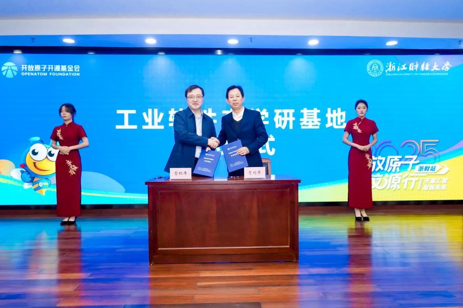 现场举行了我校信智学院与浙江省工业软件产业技术联盟签约工业软件产学研基地、开放原子开源基金会授予我校“开放原子开源社团”牌匾等仪式。