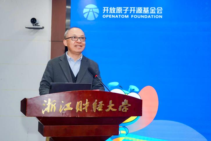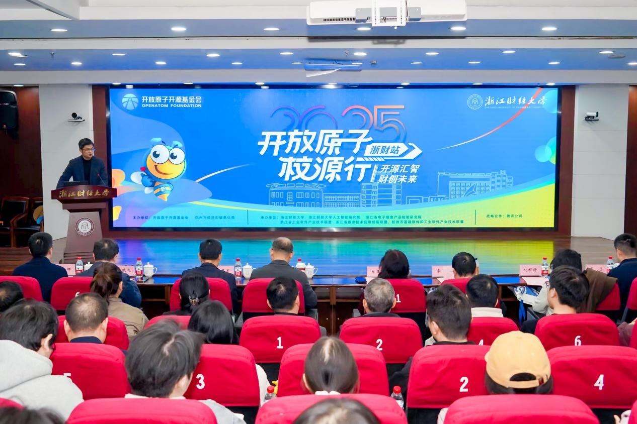 本网讯 12月9日,开放原子“校源行”活动在我校学术中心第四报告厅成功举办。本次活动由开放原子开源基金会、杭州市经信局主办,浙江财经大学、浙江财经大学人工智能研究院、浙江省电子信息产品检验研究院、浙江省工业软件产业技术联盟、浙江省信息技术应用创新联盟、杭州市基础软件和工业软件产业技术联盟承办。