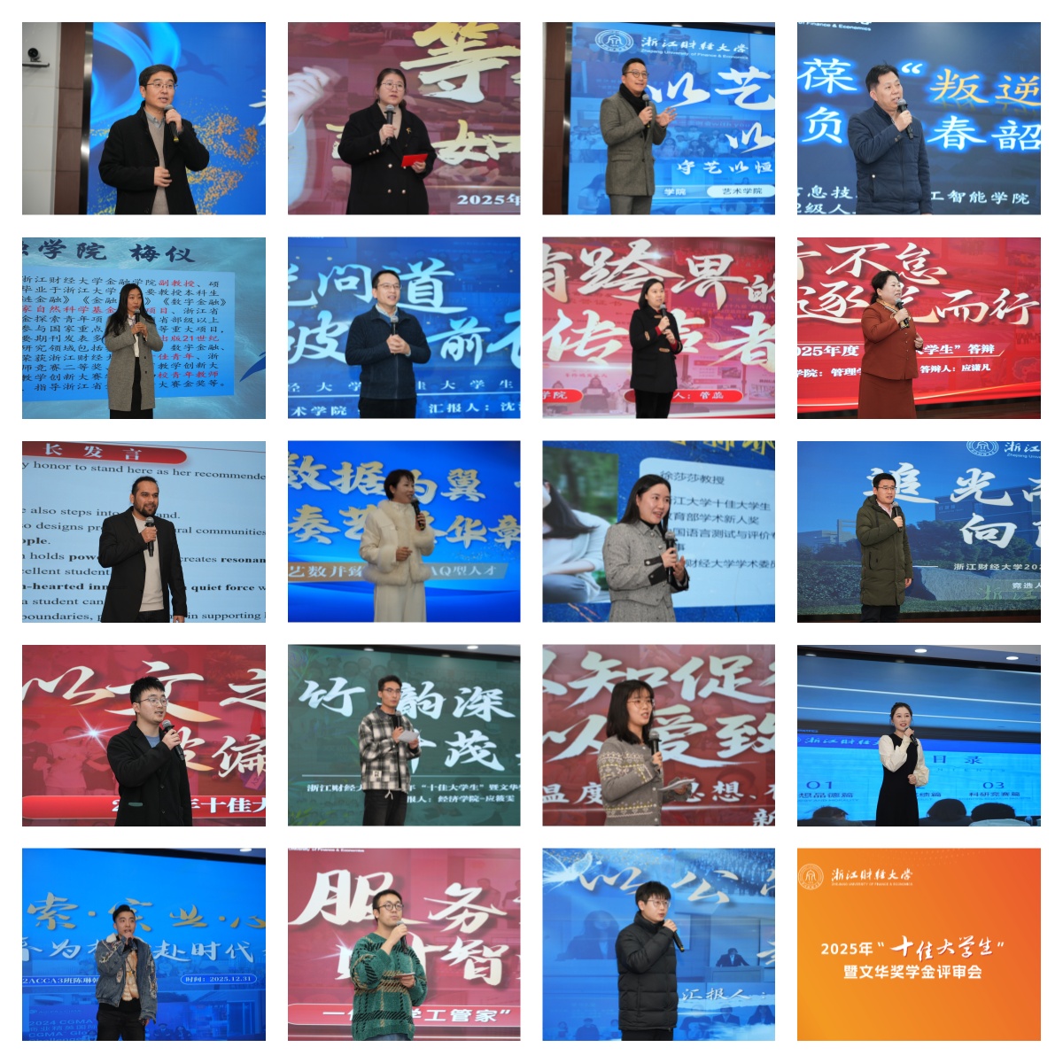 经学生申请、学院初审推荐、学校复审,共有20名候选人入围2025年“十佳大学生”暨文华奖学金现场展示。他们之中,既有在学术科研中潜心探索、发表高水平论文的“学术先锋”,也有在创新创业赛事中屡获佳绩、勇夺国家级金奖的“实践达人”;既有投身乡村振兴、将论文写在祖国大地的“乡土情怀者”,也有在文体艺术舞台上绽放光彩、摘金夺银的“多面手”。每一位候选人的展示,都是一幅勤奋、创新、担当、奉献的青春画卷,充分展现了浙财学子“进德修业,与时偕行”的精神风貌。